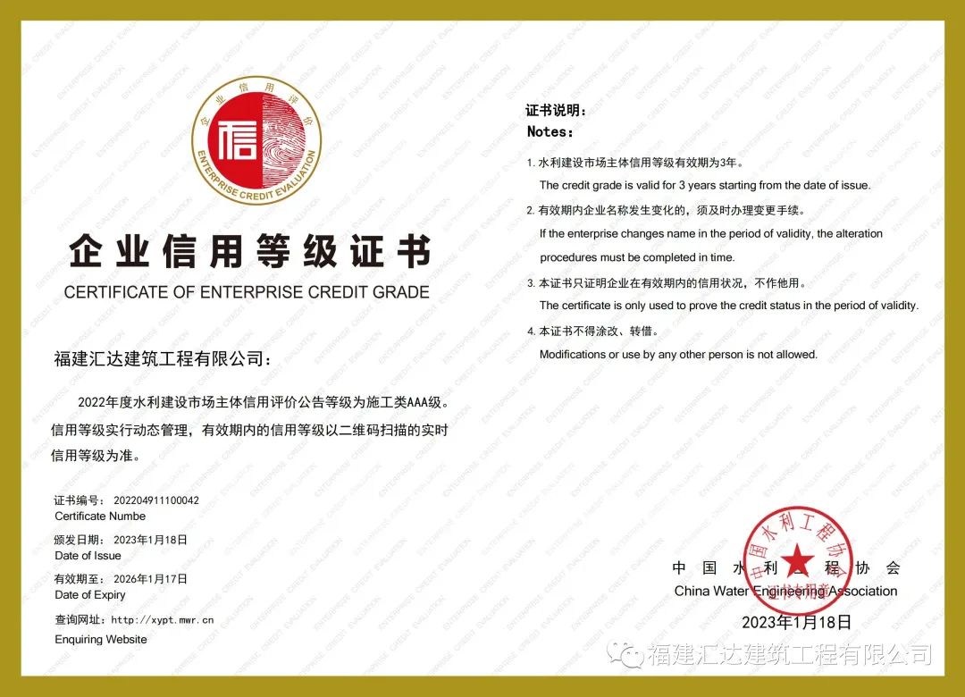 MILANCOM米兰·(中国)官方网站在2022年度水利建设市场主体信用评价公告等级为施工类AAA级